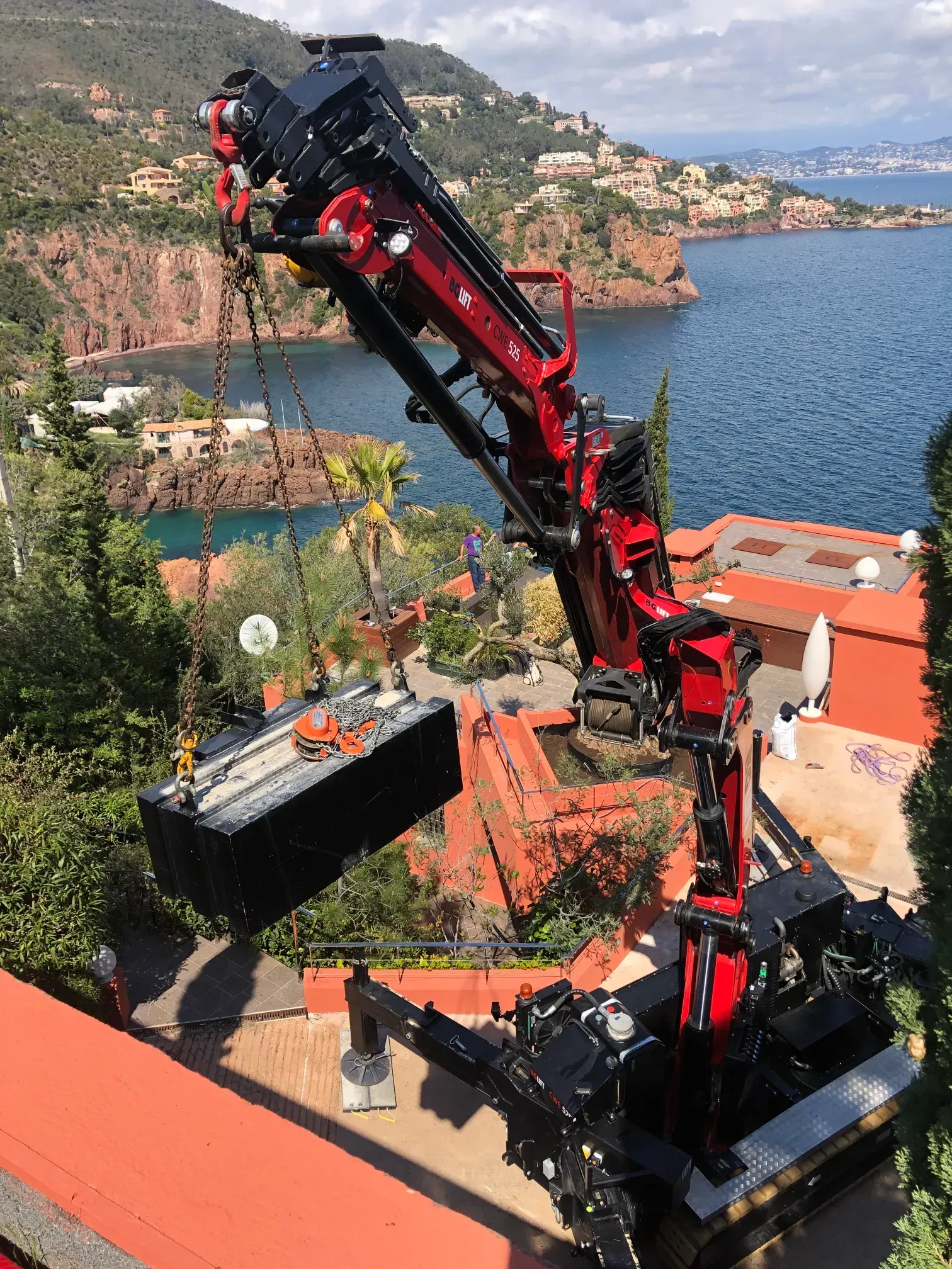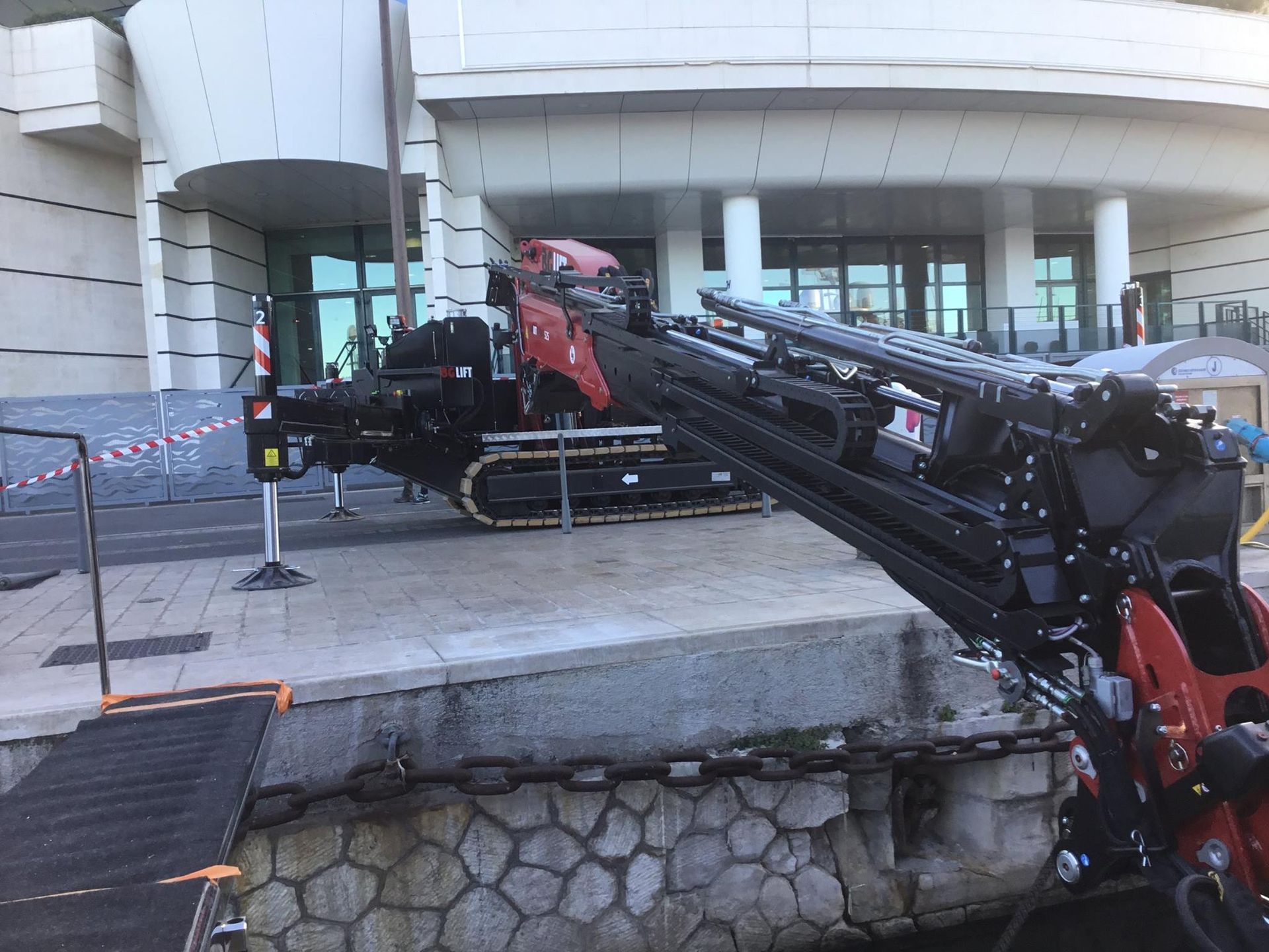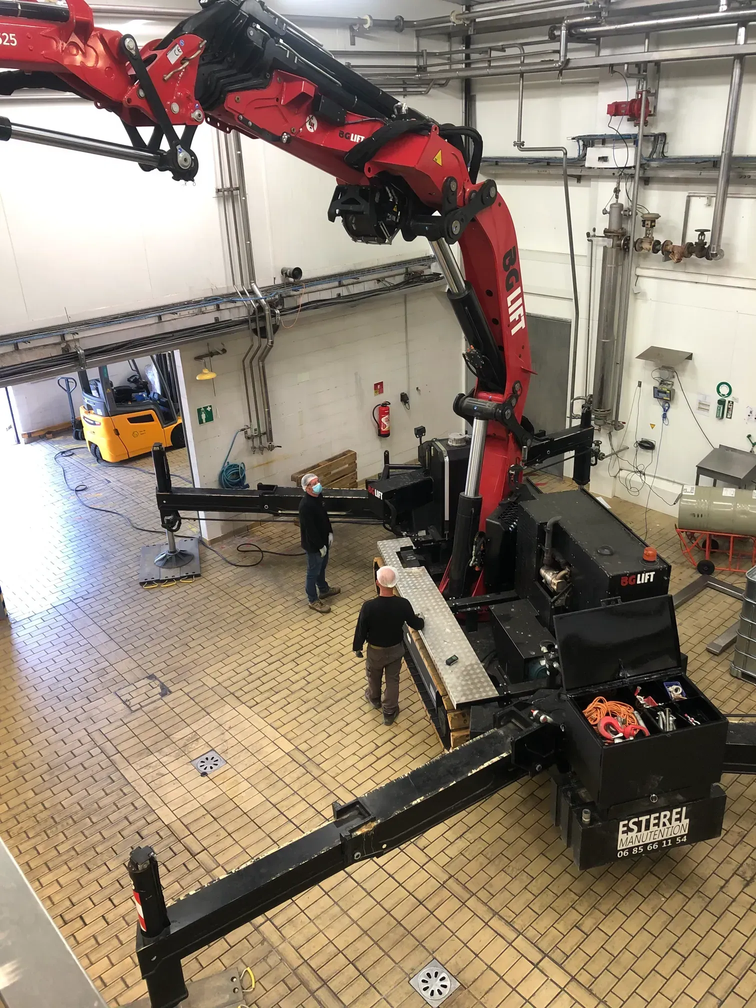 La grue peut se replier et s’introduire par une simple porte pour pouvoir opérer au plus près de la charge. Une fois dépliée, elle est capable de porter des charges allant jusqu’à 30 tonnes.
